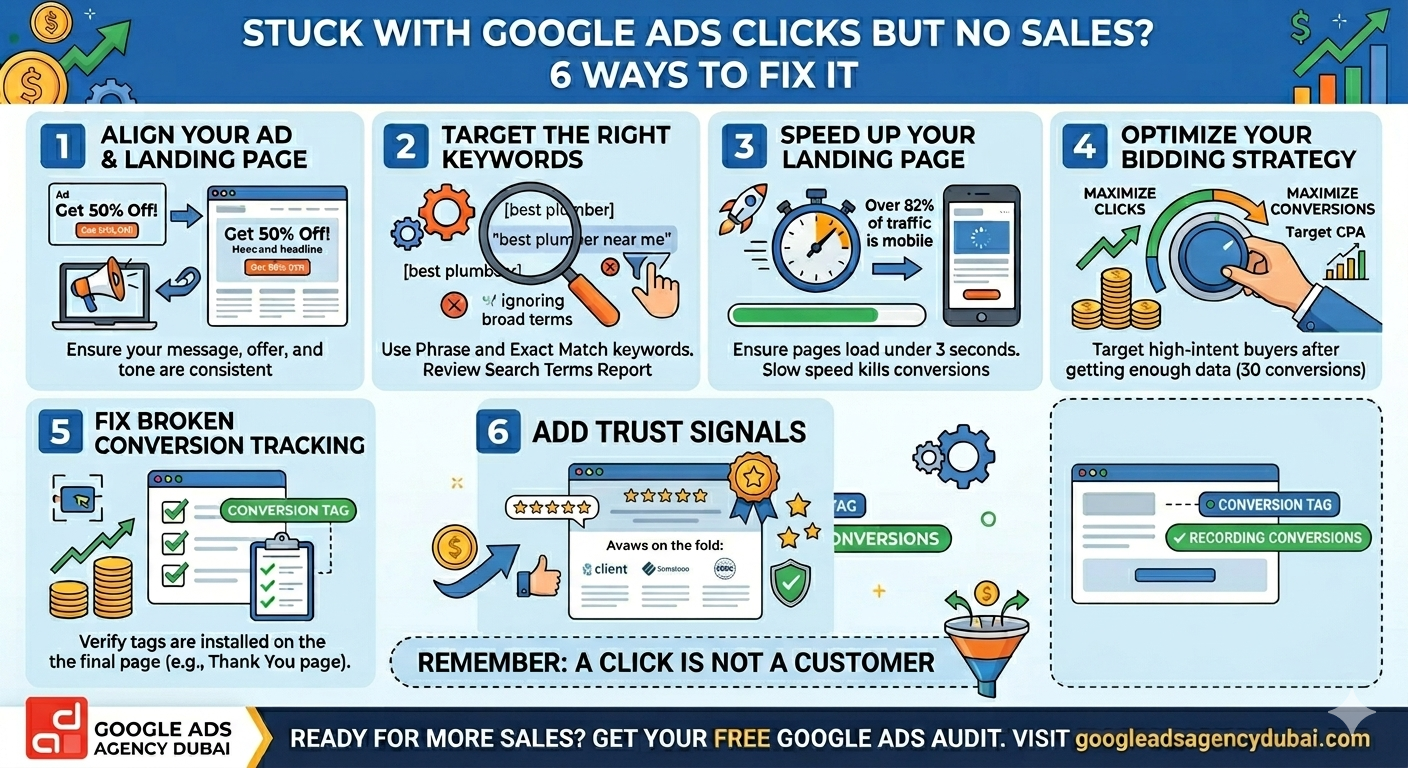 Clicks without sales is a solvable problem — your funnel is the issue, not the platform. Fix your tracking, tighten your keywords, align your landing pages, and choose the right ad type for your business goal. Visit googleadsagencydubai.com for a free Google Ads audit and we will show you exactly where your budget is leaking and how to turn your clicks into real sales.